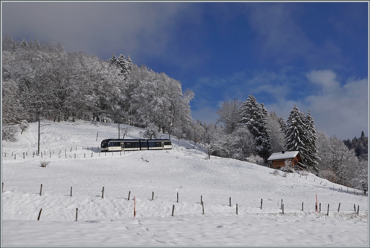 Der CEV MVR SURF ABeh 2/6 7505 ist kurz vor Fayaux als Regionalzug 1432 Les Pléiades - Vevey auf Talfahrt und fährt, nach dem es nach dem gestrigen Schneefall etwas auflockert hat, eine bezaubernde Winterlandschaft.
