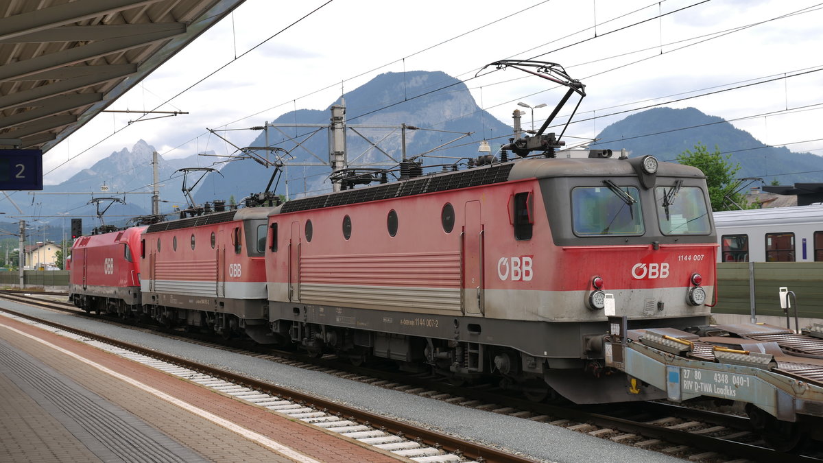 Taurus 1116 056 "Mohlibert" + 1144 069 + 1144 007 vor einem Autotransportzug in Wörgl; 12.06.2017
