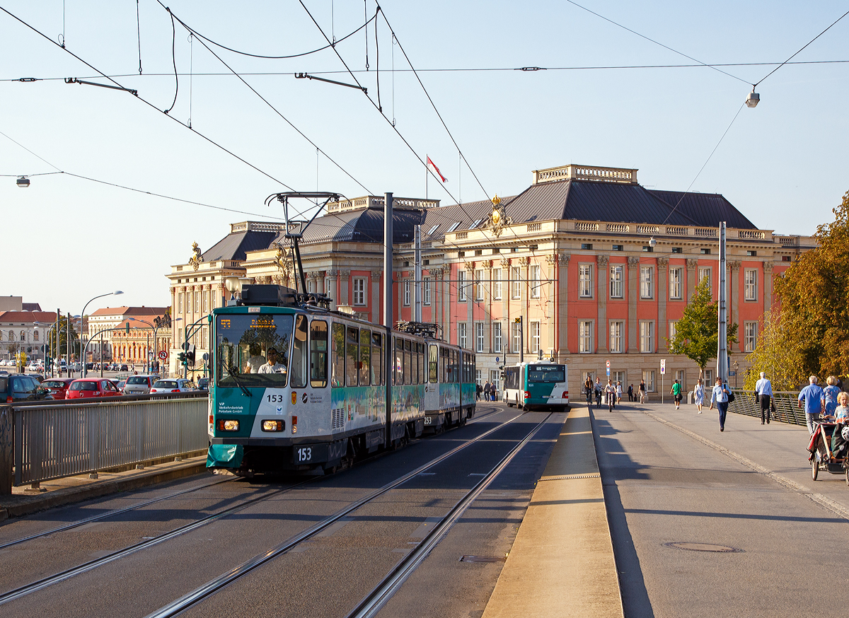 ViP 153 und 253 zwei gekoppelte Tatra KT4D-MCG Einrichtungs-Kurzgelenktriebwagen der Verkehrsbetrieb Potsdam GmbH fahren am 19.09.2018, als Linie 93 nach Bhf Rehbrücke, über die Lange Brücke in Potsdam in Richtung Hauptbahnhof. Im Hintergrund das Potsdamer Stadtschloss, Sitz des Landtags Brandenburg.