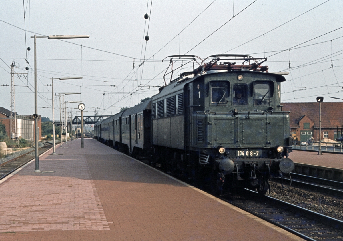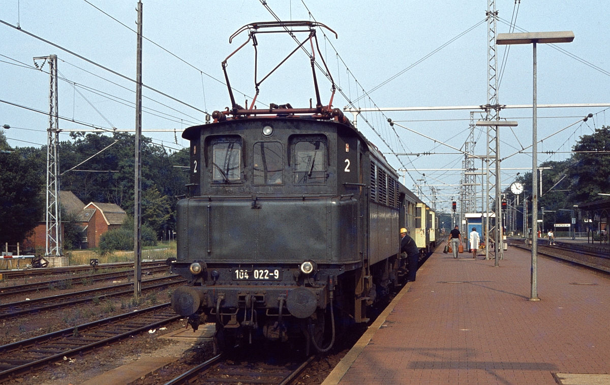 104 022 in Bad Bentheim unter umschaltbarer NS-Oberleitung (6.8.1979).