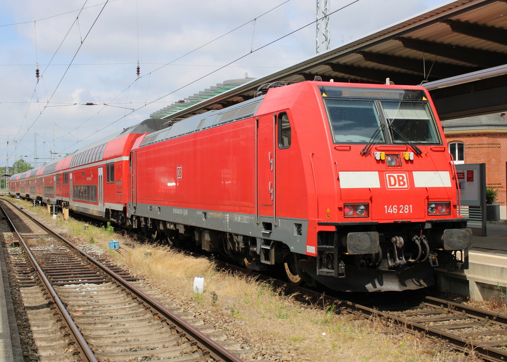 146 281 stand am 02.07.2021 abgerüstet mit RE 4310(Rostock-Hamburg)im Rostocker Hbf.