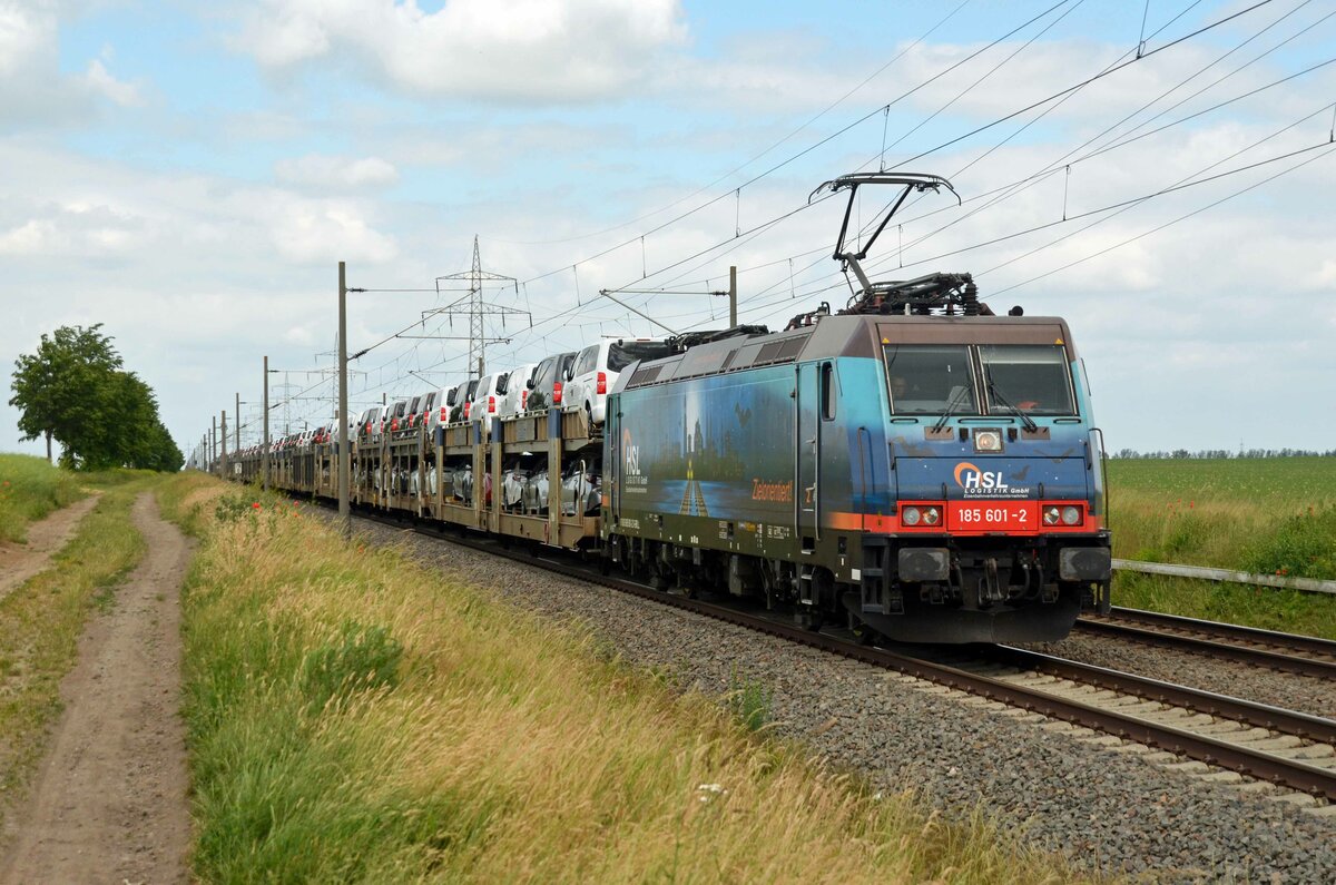 185 601 der HSL schleppte am 13.06.21 einen mit Toyotas beladenen BLG-Autozug durch Braschwitz Richtung Halle(S).