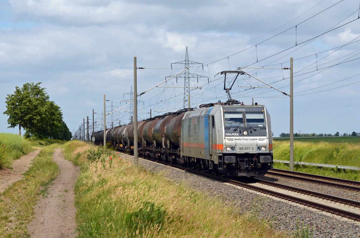 185 677 der WFL schleppte am 13.06.21 einen Kesselwagenzug durch Braschwitz Richtung Halle(S).