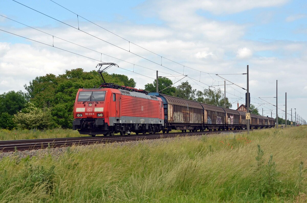 189 016 führte am 13.06.21 einen kurzen Güterzug durch Braschwitz Richtung Halle(S).