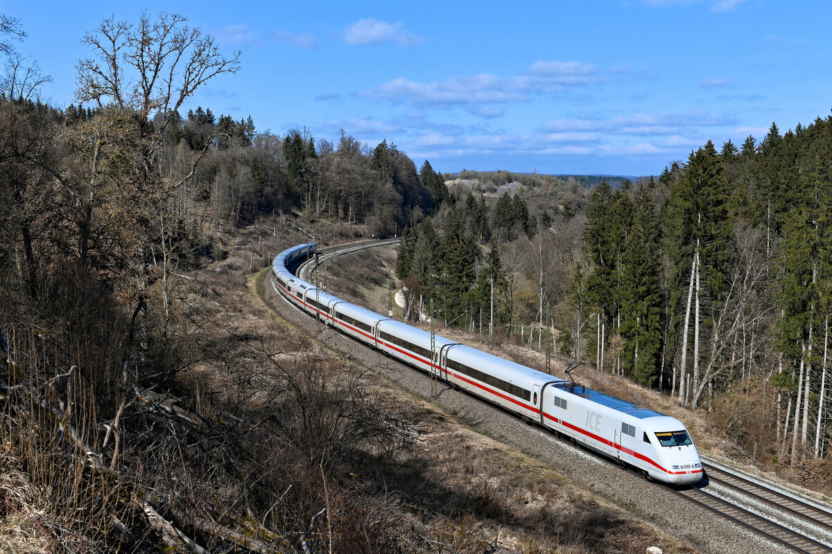 Alles Gute zum 30. Geburtstag! Seit drei Jahrzehnten prägt nun der ICE das Gesicht des deutschen Fernverkehrs auf Schienen. 1991 gelangte die Baureihe 401 in den Plandienst und die erste ICE-Linie von München nach Hamburg nahm ihren Betrieb auf. Passend zu diesem Jubiläum konnte ich am 02. April 2021 den Baureihen-Erstling 401 001 als ICE 787 von Hamburg-Altona nach München HBF bei Gundelsheim auf der Fränkischen Alb fotografieren.