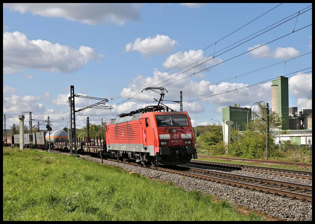 Am Stadtrand von Lengerich ist hier am 7.5.2021 um 16.21 Uhr in Höhe der Dyckerhoff Zement Werke die DB 189021-9 mit einem Güterzug in Richtung Münster unterwegs.