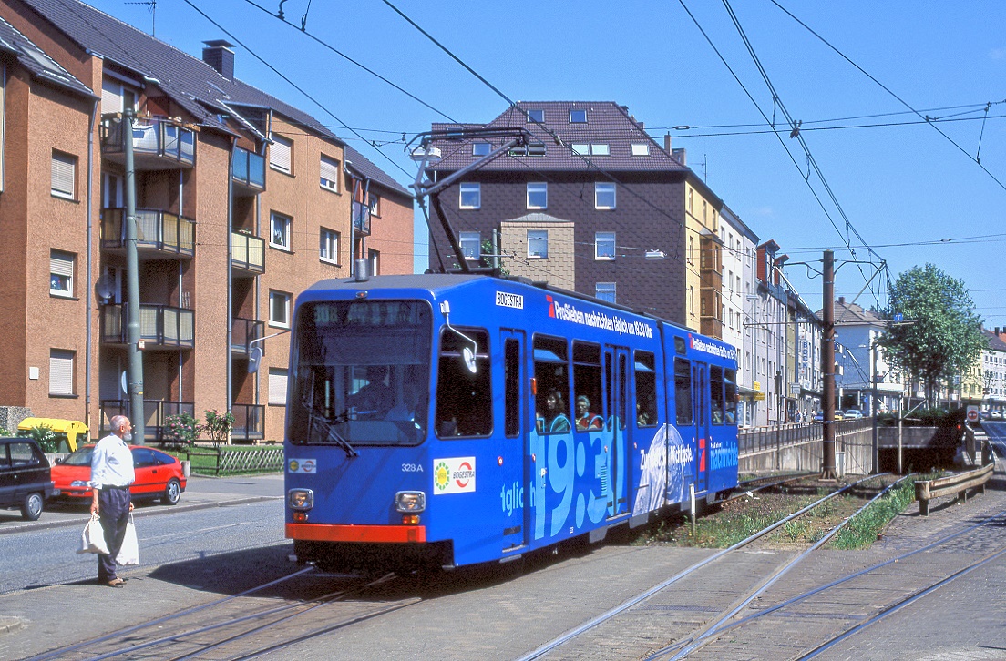 Be 6/8 Combino 328, auf der Linie 2, wartet in der Schlaufe beim Eglisee. Die Aufnahme stammt vom 14.06.2021.
