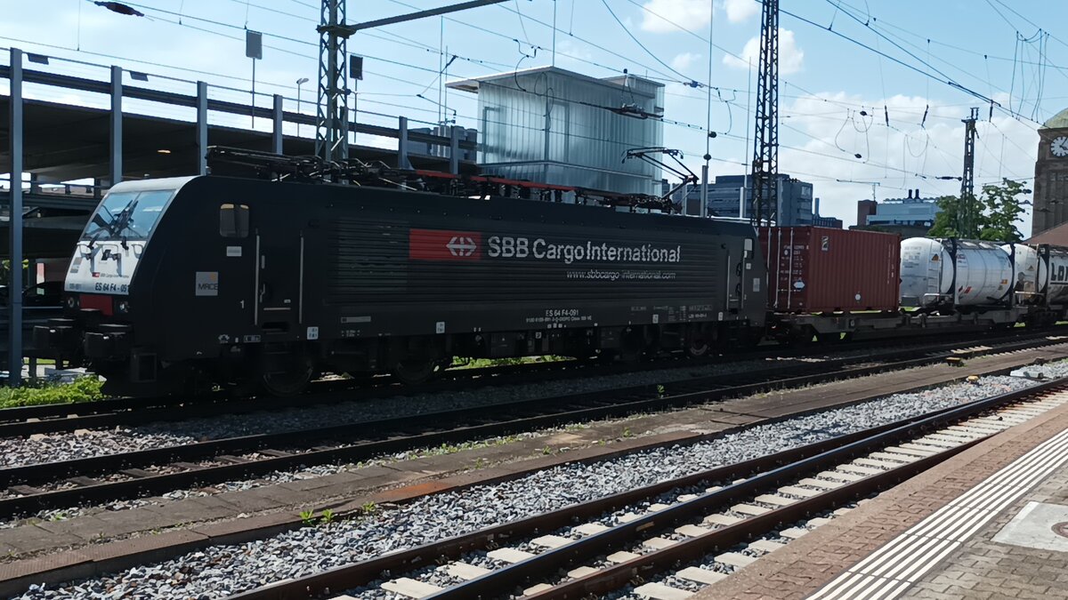 BR 189 091 mit einem Containerzug am 02.07.21 In Badischen Bahnhof