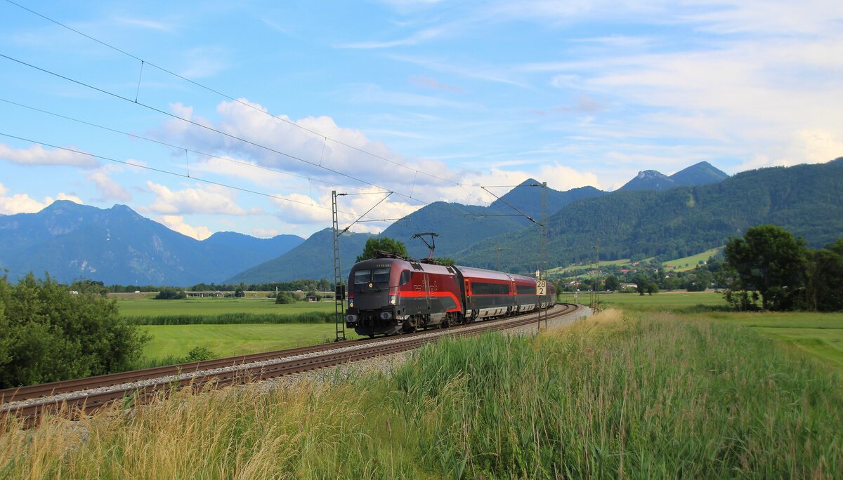 Die andere Rückseite der 1116 229 "Steinbach - we are pool" am RJX 169 nach Wien Hbf. Ötztal-Bahnhof am 27.06.2021