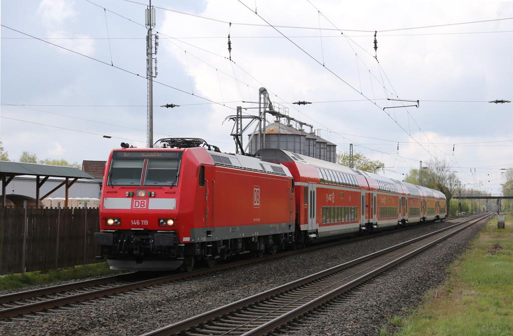 DB 146119 fährt hier mit dem RE 2 aus Düsseldorf am 6.5.2021 um 10.57 Uhr durch den Bahnhof Natrup Hagen in Richtung Zielbahnhof Osnabrück.