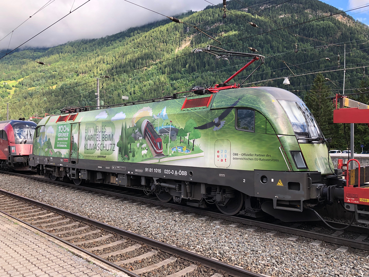 Die Rückseite der 1016 020 "Klima- und Umweltschutz Lok". Vor der Lok stand RJX 862 aus Flughafen Wien. Ötztal-Bahnhof am 30.06.2021