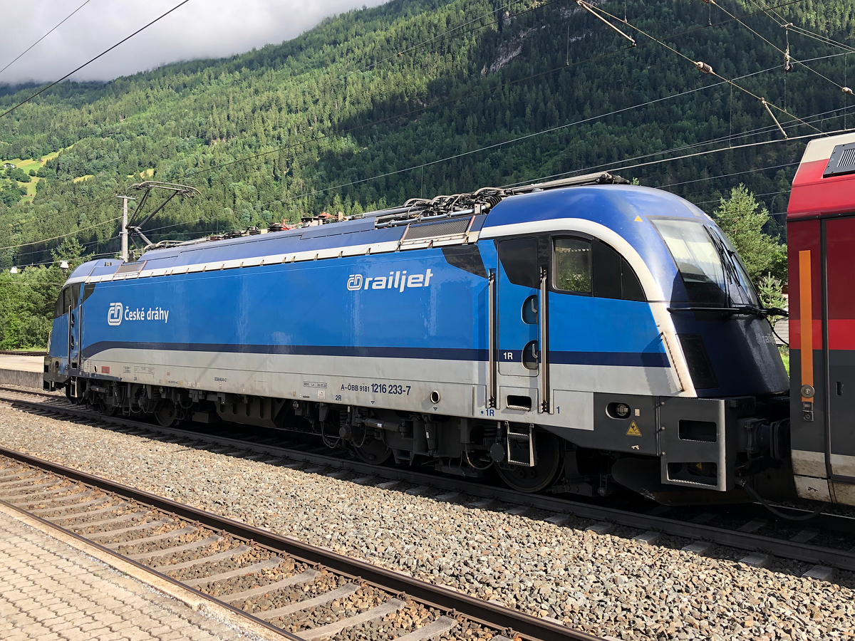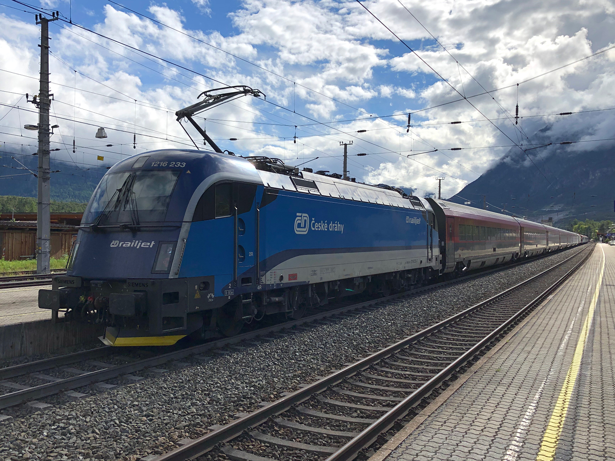 Ein seltener Gast auf der Arlbergbahn. ÖBB/ČD 1216 233-7 am Zugschluss des verkehrt gereihten RJX 862 von Flughafen Wien. Aufgrund von Bauarbeiten endete dieser Zug in Ötztal-Bahnhof. Aufgenommen am Abend des 30.06.2021