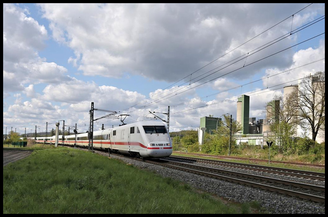 Ein ICE 1 passiert hier am 7.5.2021 um 16.18 Uhr auf der Fahrt nach Münster in Westfalen die Dyckerhoff Zementwerke in Lengerich.