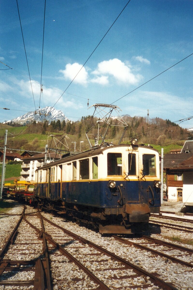 Historischer Gepäck- und Posttriebwagen DZe 6/6 der Montreux-Berner Oberland-Bahn (MOB) in Montbovon (797 m), im April 2003. Wurde 2008 an die Museumsbahn Blonay–Chamby übergeben.