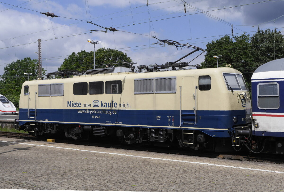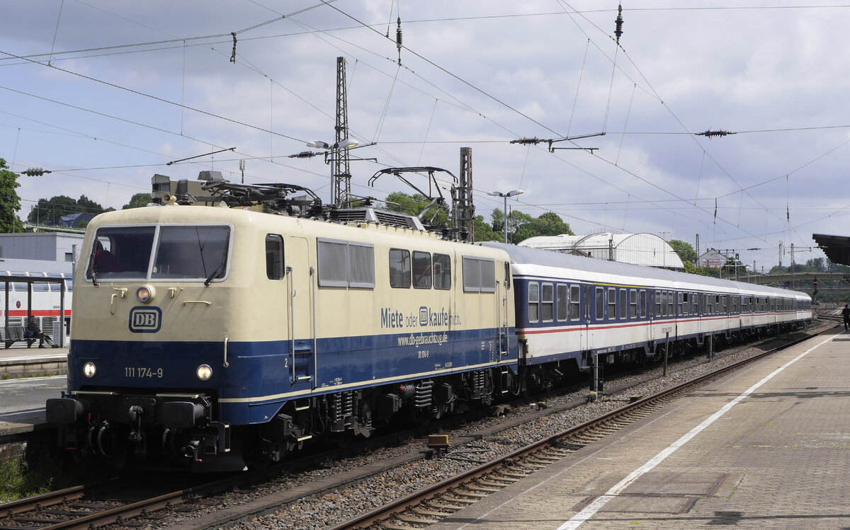 Langweilig wird der RB48-Ersatzzug von National Express wirklich nicht. Hier die aktuelle Komposition: 111 174-9 von DB in werbewirksamem Ozeanblau-Beige und 5 TRI-n-Wagen. Wuppertal-Oberbarmen, 2.7.21.