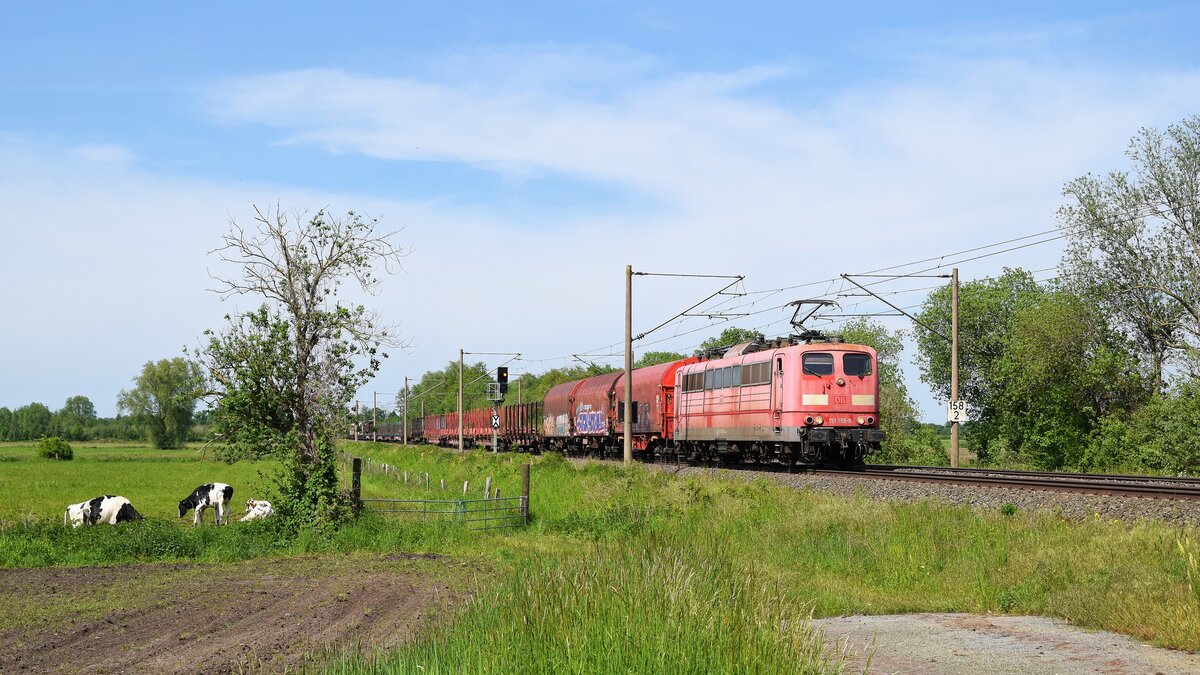 Railpool 151 155 (ex DB), vermietet an DB Cargo, mit gemischtem Güterzug in Richtung Osnabrück (Hüde, 01.06.2021).