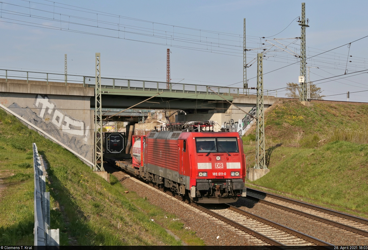 Containerzug mit 189 011-0 (Siemens ES64F4) unterwegs in Halle (Saale), Birkhahnweg, in südlicher Richtung.