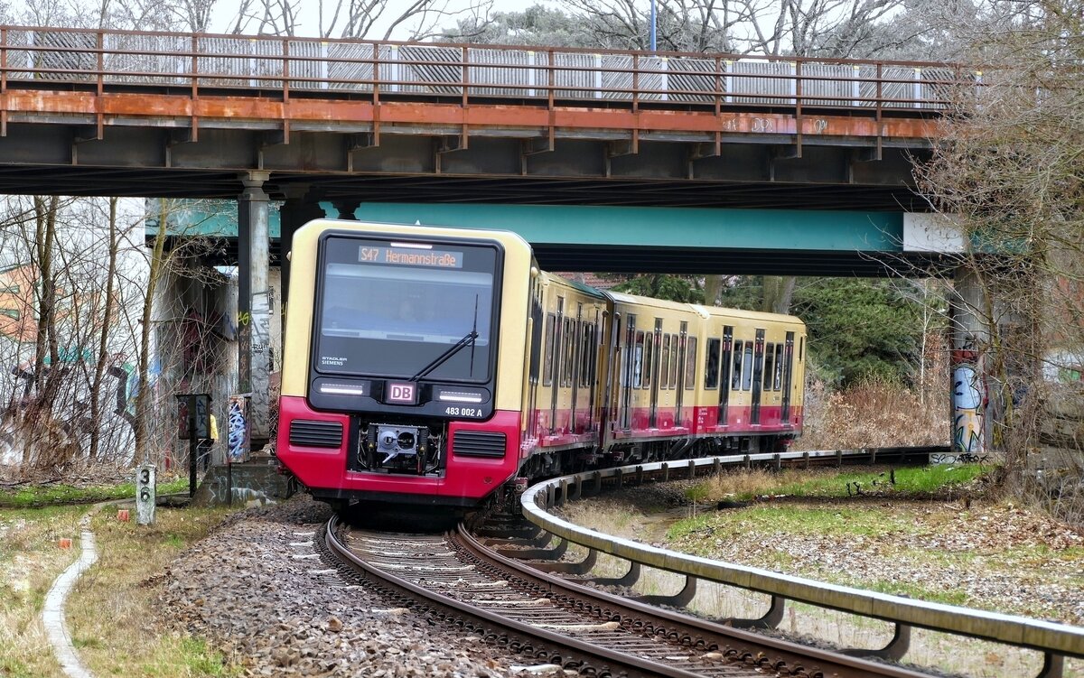 S47, im Gleisbogen der S-Bahn Berlin mit BR 483 002 A und 483 004 A, hier kommend zwischen B Spindlersfeld und B Oberspree mit Fahrtziel S+U Hermannstr. im März 2021.0,0