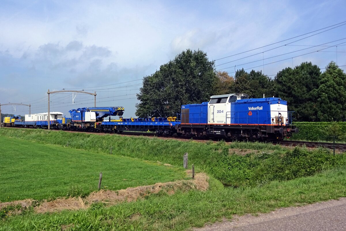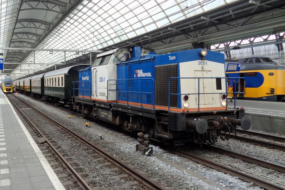 Volker Rail 203-1 schleppt ein Überbringungszug mit fünf VSM-Wagen durch Amsterdam Centraal am 9 Juli 2018.