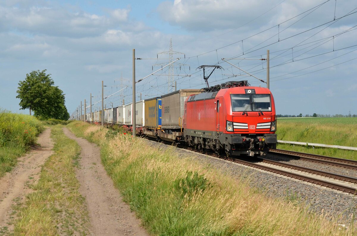 Wegen Bauarbeiten in Neustrelitz wurden die KLV-Züge von und nach Rostock statt über Berlin über Magdeburg umgeleitet. Hier rollt 193 319 mit einem Schenker-KLV am 13.06.21 durch Braschwitz Richtung Halle(S).