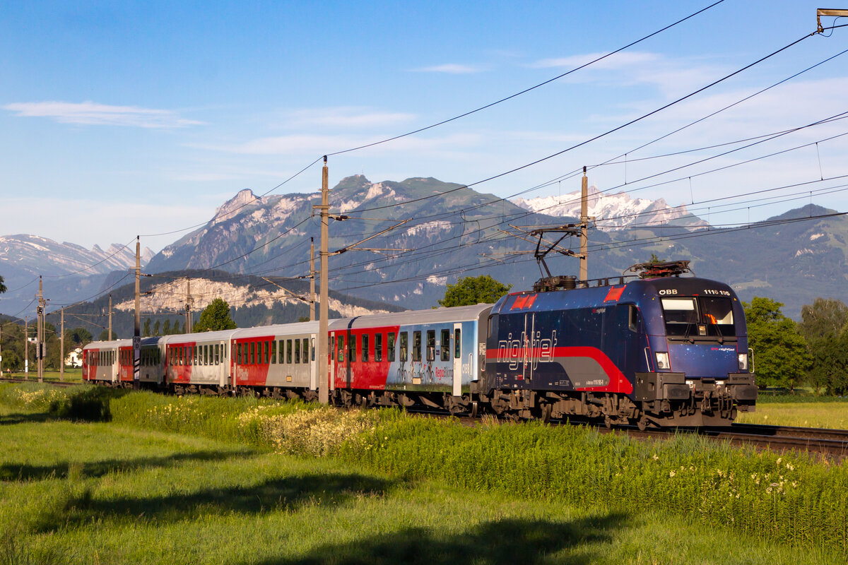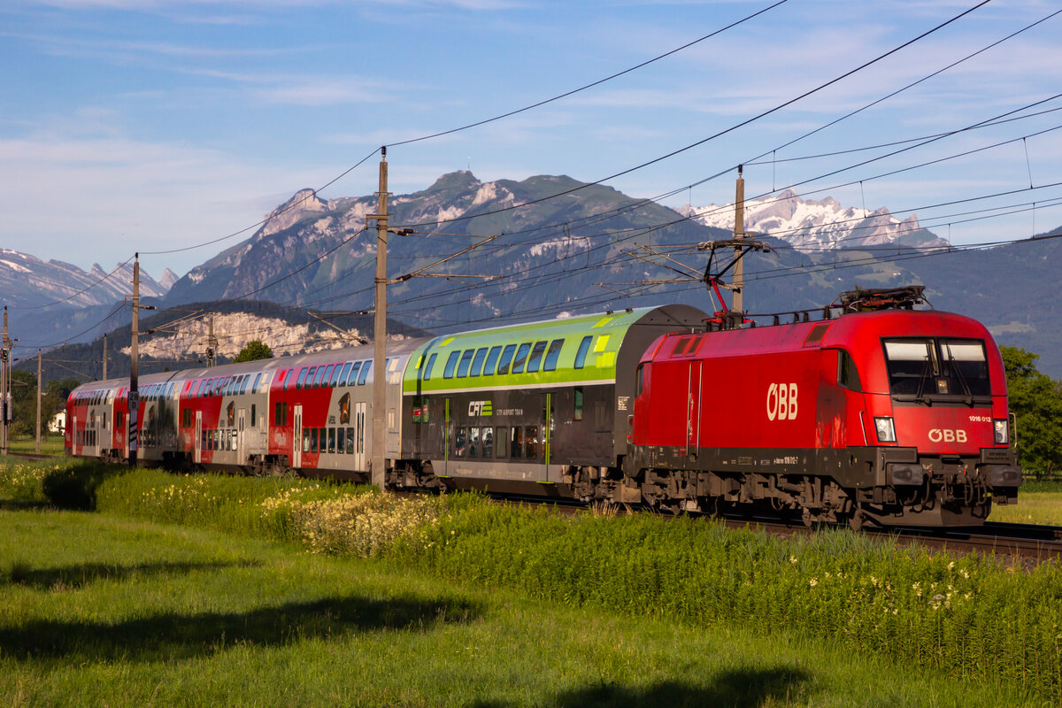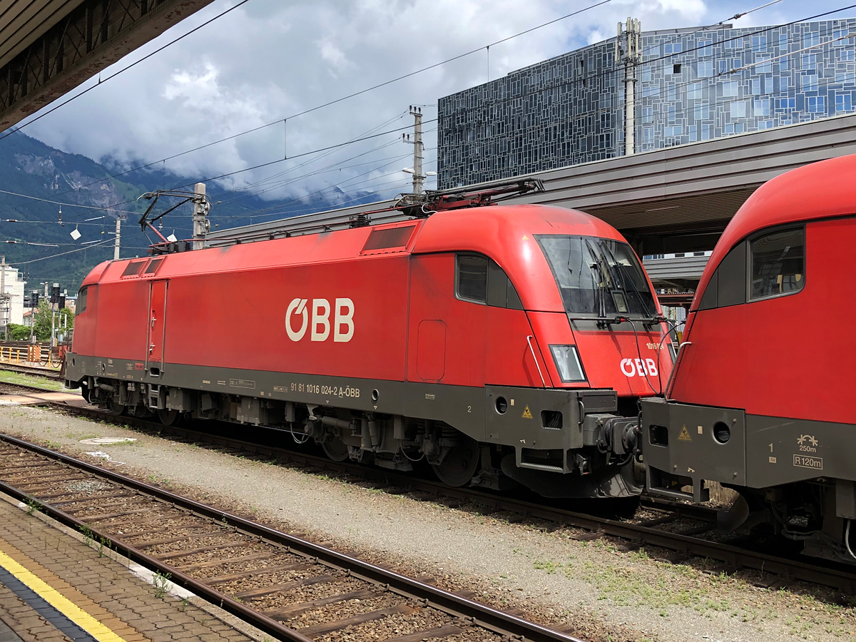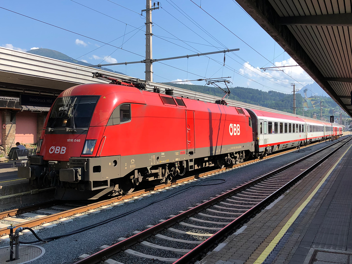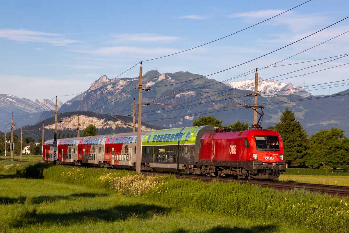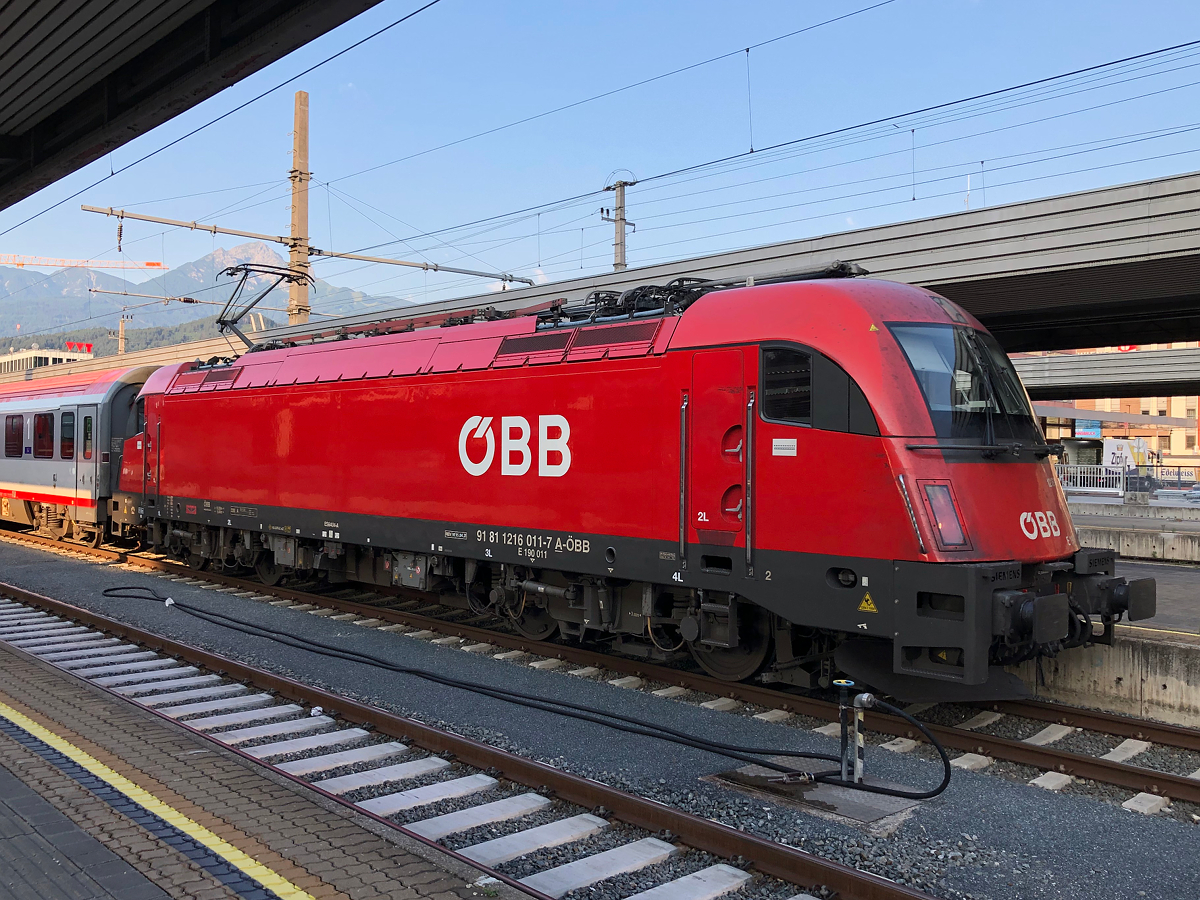 ÖBB 1216 011-7 mit EC 87 von München Hbf nach Venezia Santa Lucia hier kurz vor dem Bahnhof St. Jodok am Brenner. Aufgenommen am 23.07.2021