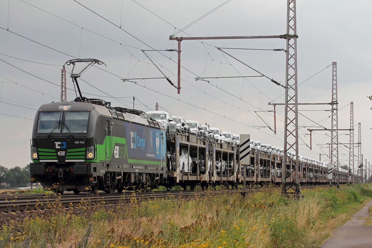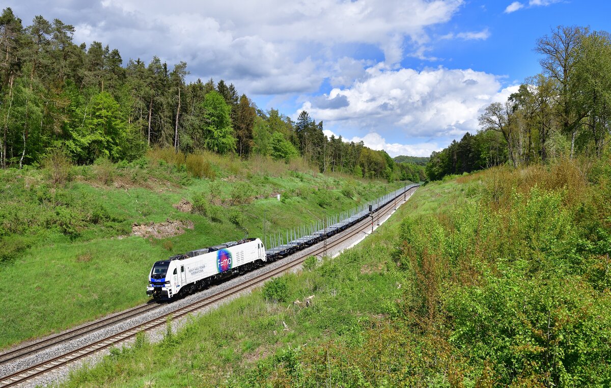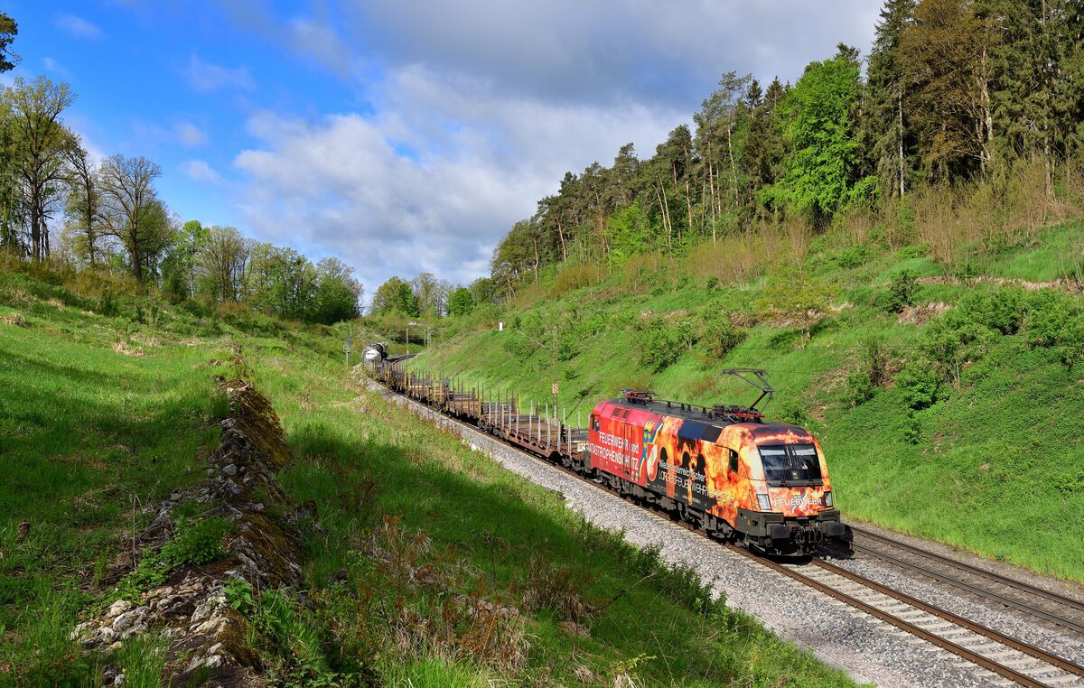 Die von CargoServ eingesetzte 193 250 ist häufig vor dem DGS 48963 von Ingolstadt nach Linz Stahlwerke zu beobachten. Mit diesem Zug werden primär Stahlreste aus der Automobilproduktion der Wiederverwertung zugeführt. Am 11. Mai 2021 konnte ich die Lok, die für den Hauptauftraggeber des österreichischen EVUs wirbt, vor der besagten Leistung bei Einöd in Niederbayern fotografieren.