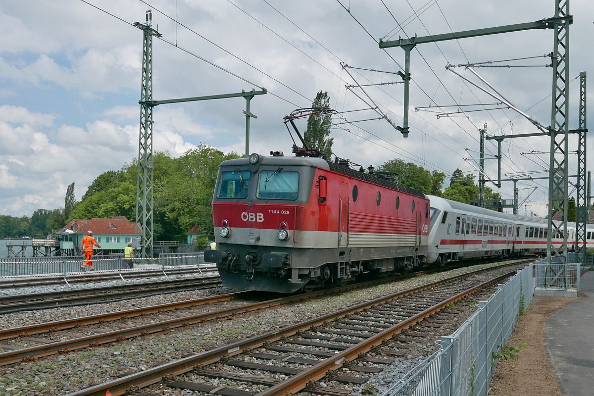 1144 029 mit den Wagen IC 118  BODENSEE , Bludenz - Bochum, kurz vor der Einfahrt in den Bahnhof Lindau-Insel am 23.06.2021