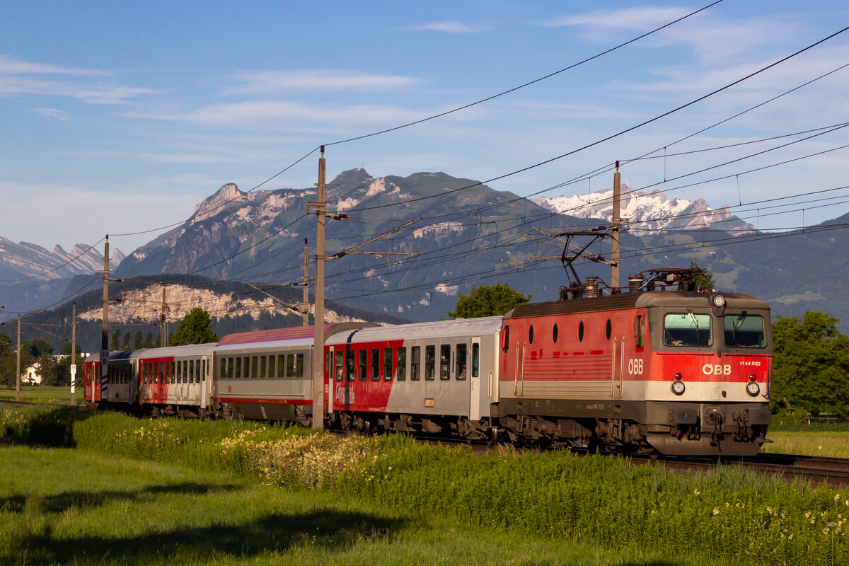 1144 029 mit den Wagen IC 118 "BODENSEE", Bludenz - Bochum, kurz vor der Einfahrt in den Bahnhof Lindau-Insel am 23.06.2021