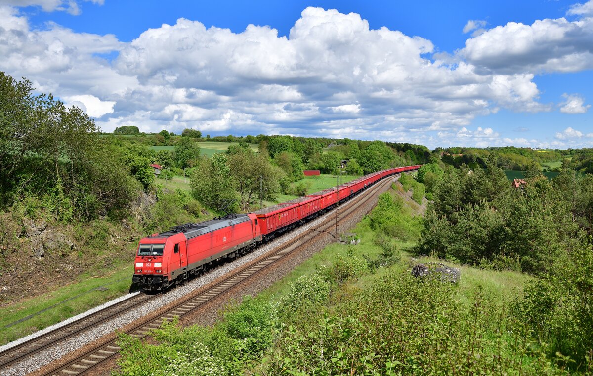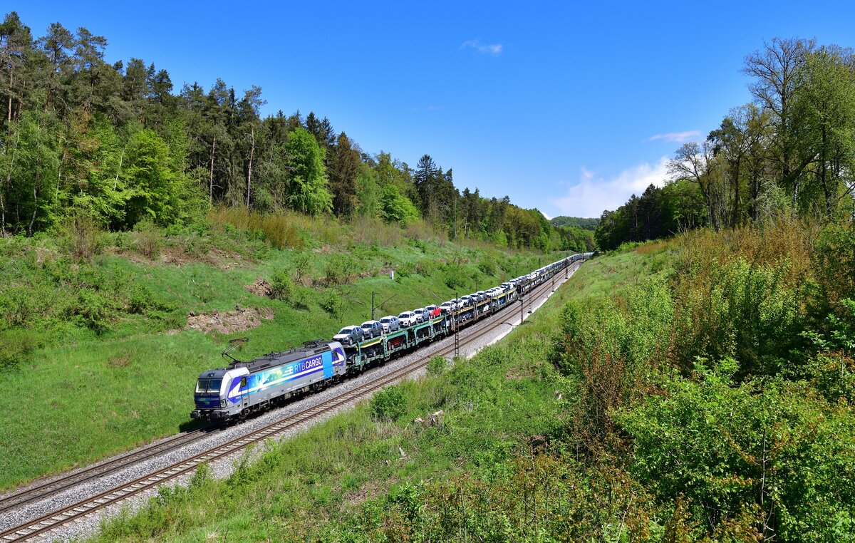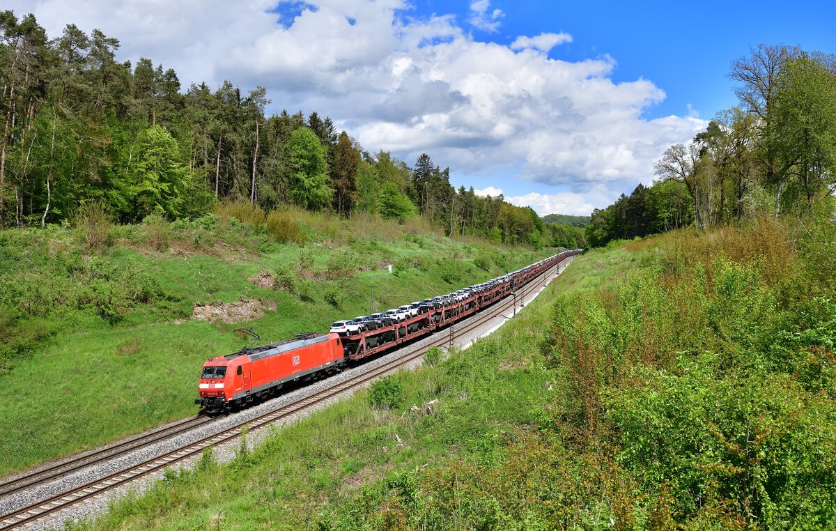 185 047 mit einem Autozug am 22.05.2021 bei Sinngrün.