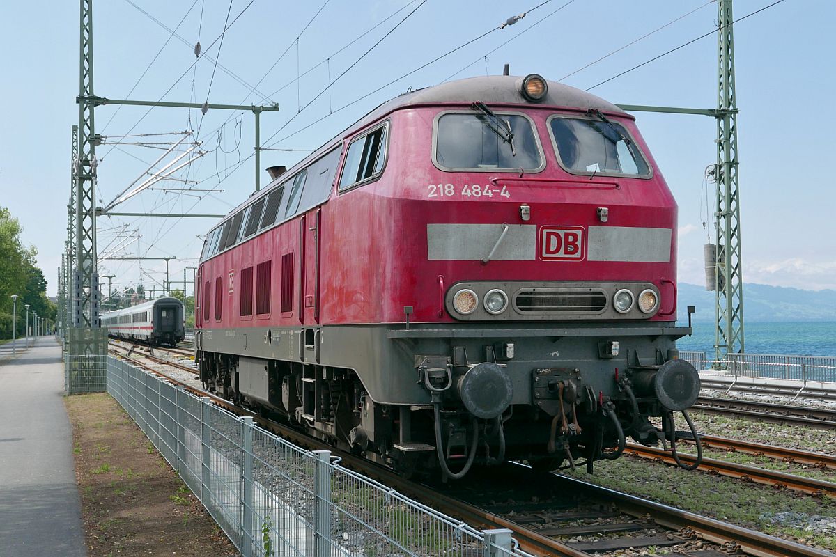 218 484-4 bei der Rangierfahrt auf dem Bodenseedamm in Lindau, um später die Wagen des IC 118, Bludenz - Dortmund, übernehmen zu können (23.06.2021)
