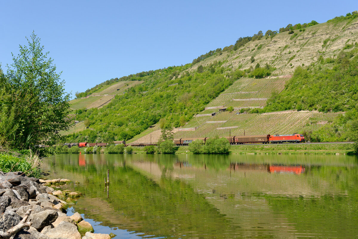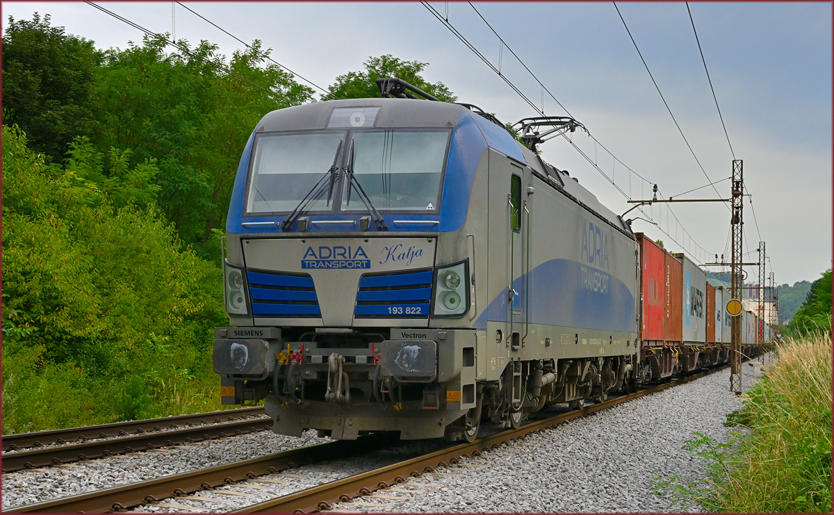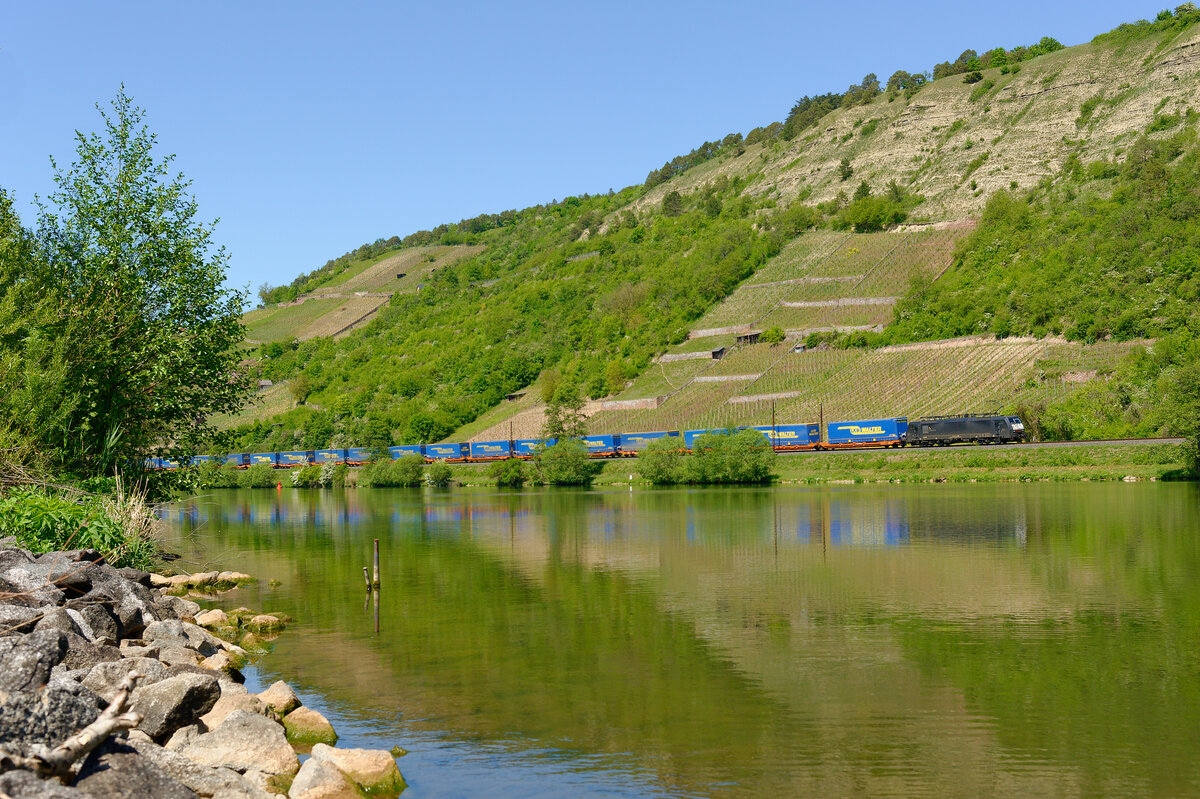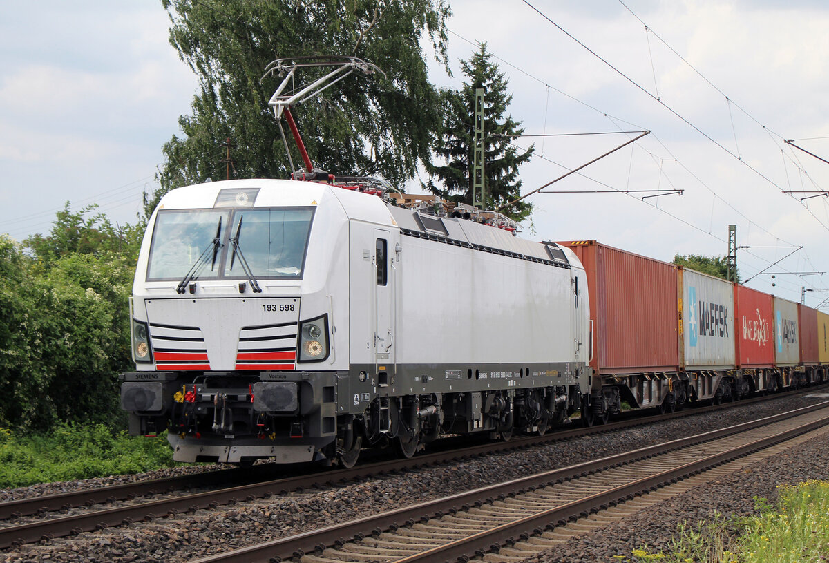 193 882 mit einem Containerzug am 22.05.2021 bei Sinngrün.