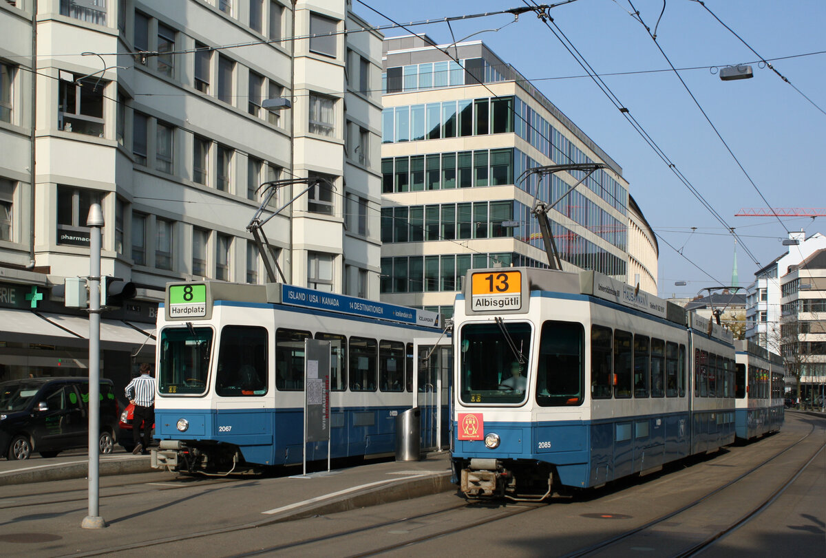 Be 4/6 2067 und 2085 an der Haltestelle Stockerstrasse am 20.03.2015.
