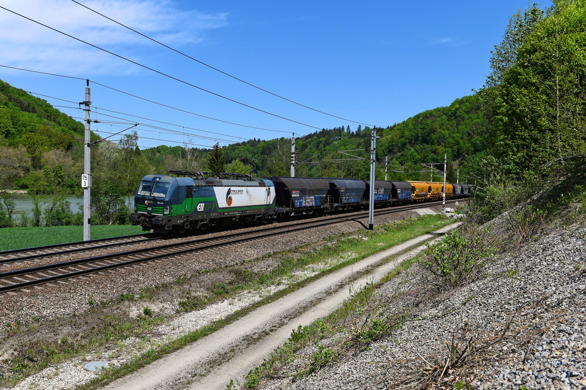 Der an das slowakische Unternehmen Petrolsped vermietete ELL-Vectron 193 215 konnte am 11. Mai 2021 mit einem Getreidezug bei Schardenberg beobachtet werden. Das war auch das letzte Bild des Tages, die links im Bildrand aufziehende Bewölkung beendete den Fotoausflug an die Passauer Bahn.