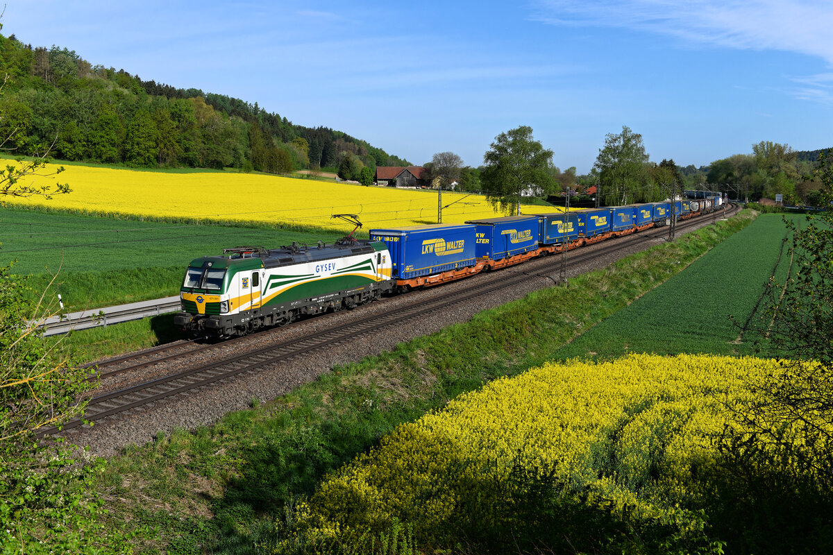 Mit dem Containerzug DGS 43933 von Dradenau nach Linz Vbf war am 11. Mai 2021 die 193 243 unterwegs. Die von der Wiener Lokalbahnen Cargo bei ELL angemietete Lok trägt eine Seitenwerbung, mit der nach neuem Personal gesucht wird. Bei Einöden in Niederbayern wurden zwei blühende Rapsfelder passiert.