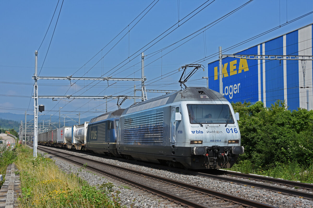 Doppeltraktion, mit den BLS Loks 465 016-4 und 465 006-5, fährt Richtung Bahnhof Itingen. Die Aufnahme stammt vom 20.07.2021.