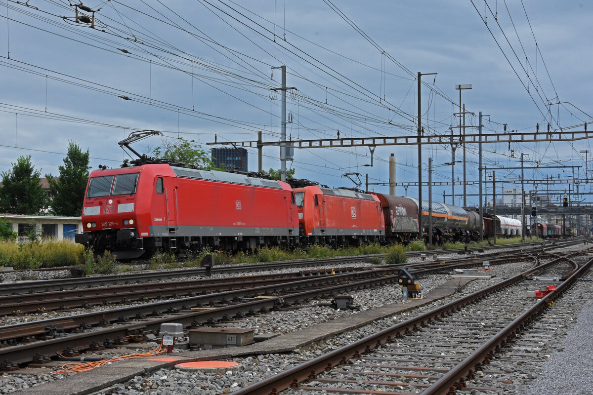 Doppeltraktion, mit den DB Loks 185 129-4 und 185 137-7 durchfährt den Bahnhof Pratteln. Die Aufnahme stammt vom 07.07.2021.