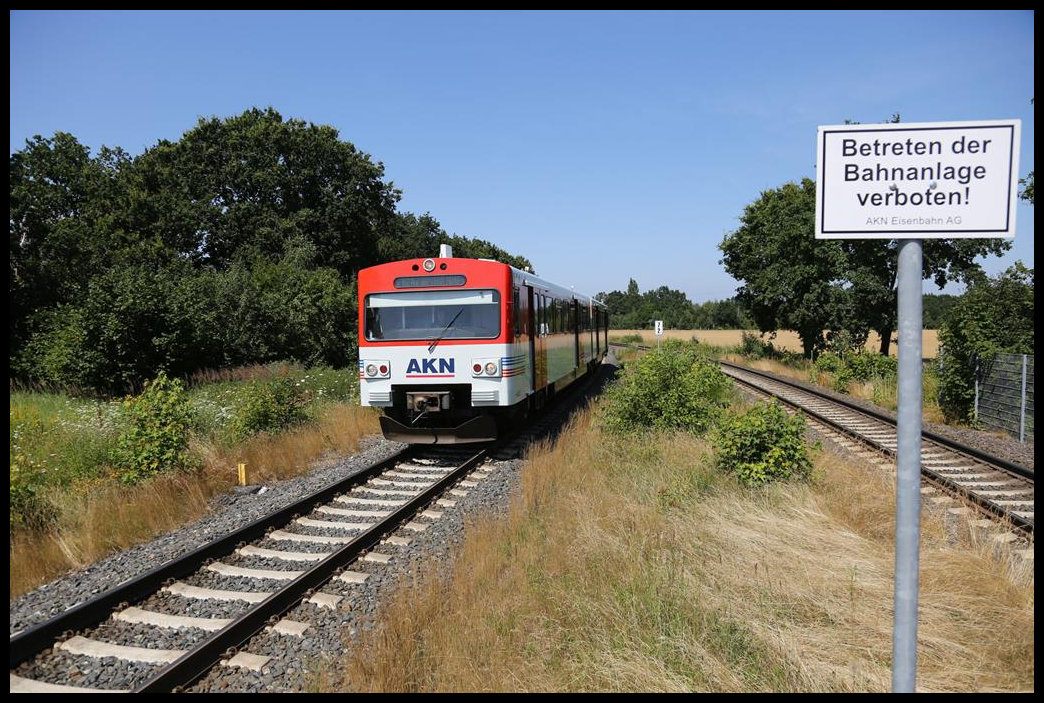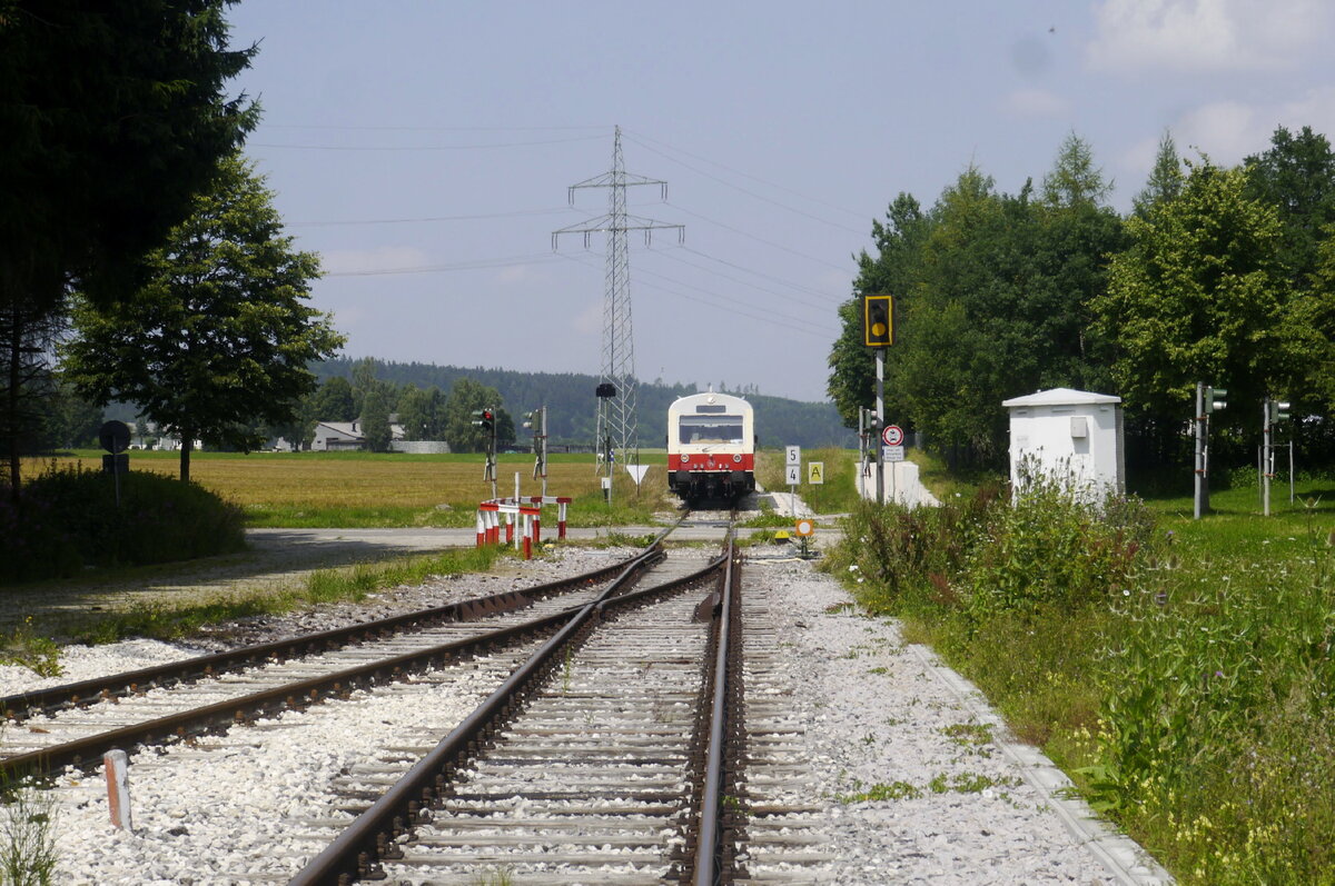 SAB-Zug Nr 88203 mit VS 250 an der Spitze und VT 129 nähert sich dem Kreuzungsbahnhof Haidkapelle (mit Rückfallweiche; vgl. das orangefarbene Weichensignal), wo der Gegenzug 88204 fahrplanmäßig 26 Minuten auf die Kreuzung wartet. Aufgenommen am 21.7.21 vom Überweg Mittelbahnsteig - Parkplatz.