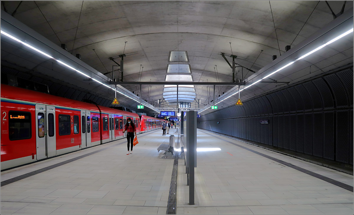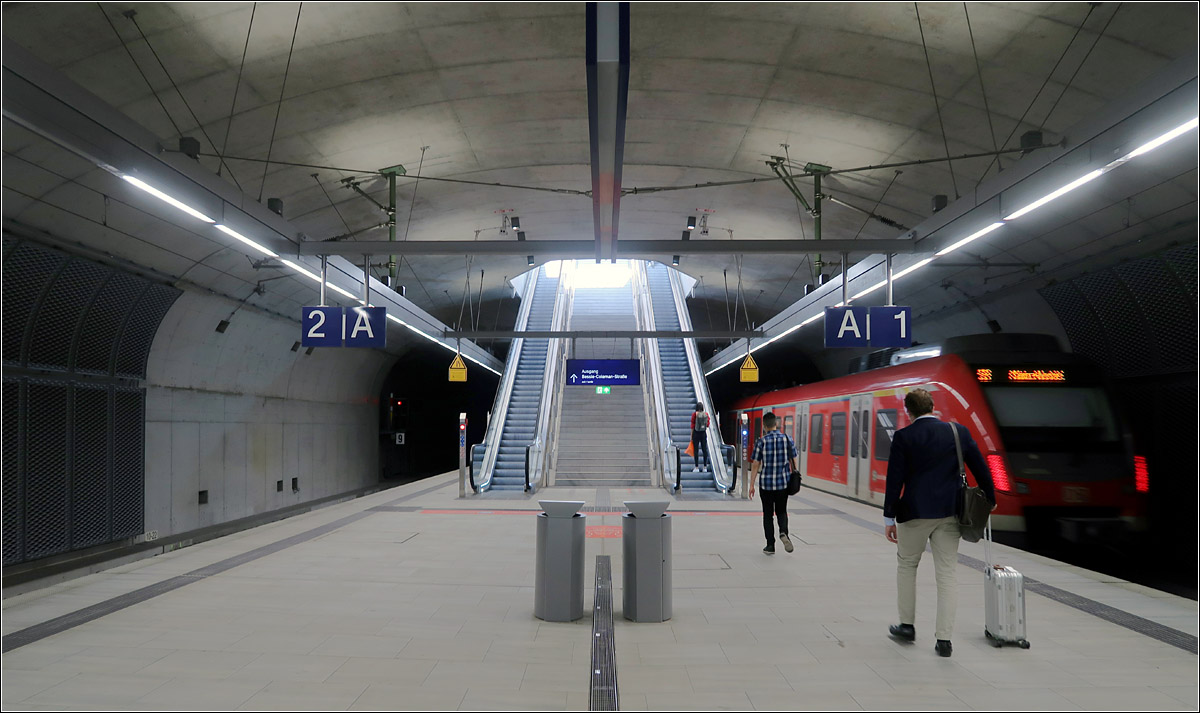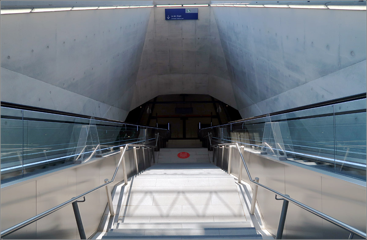 Gateway Gardens - ein neuer Tunnelbahnhof in Frankfurt - Die einstige US-Militärsiedlung Gateway Gardens beim Frankfurter Flughafen wurde nach Abzug der Amerikaner in einen neuen Stadtbezirk umgewandelt mit Flächen für Büros- und Dienstleitungen. Wohnungsbau gibt es da nicht aber etliche Hotels. Um das Gebiet gut an den öffentlichen Nahverkehr anzuschließen wurde die Schleifenstrecke der Flughafenbahn (S- und Regionalverkehr) im östlichen Teil neu trassiert und eine neue unterirdische Station gebaut. Hier ein Blick auf den westlichen Abgang zum Bahnsteig. Die Treppen führen von der Oberfläche direkt hinunter auf den Bahnsteig. 21.07.2021 (M)