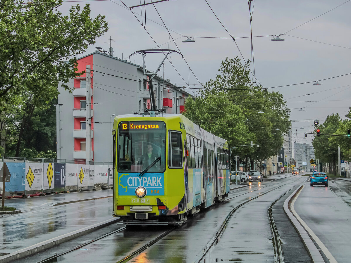 Graz. TW 609 der Graz Linien steht hier am Abend des 25.05.2021 als Linie 13 in der Haltestelle Fröhlichgasse.