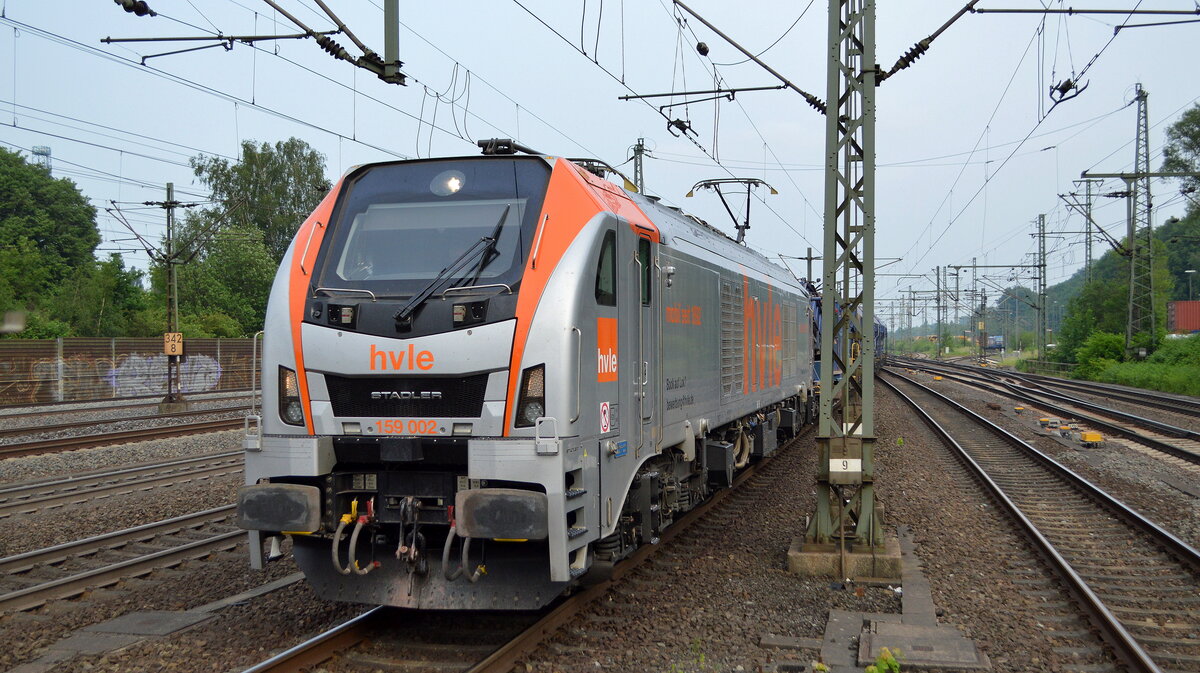 Havelländische Eisenbahn AG, Berlin-Spandau [D] mit "159 002" [NVR-Nummer: 90 80 2159 002-5 D-HVLE] und einem Schüttgutförderzug Richtung Hamburger Hafen am 07.06.21 Durchfahrt Bf. Hamburg-Harburg.