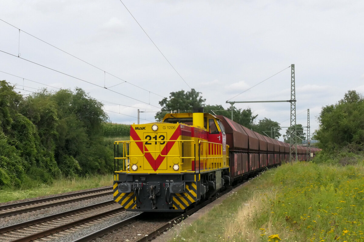 DeltaRail GmbH, Frankfurt (Oder) [D] mit der angemieteten Luxemburger MaK G 1206 [NVR-Nummer: 92 82 0001 508-1 L-DELTA] mit Materialförder- und Silowagen der Fa. mgw am Haken am 14.06.21 Berlin Hirschgarten.