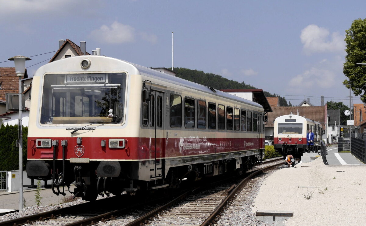 Nach einem Rangiermanöver wird VT 411 an VT 413 angekuppelt, und beide bilden zusammen die SAB-Fahrt Nr. 88204 Trochtelfingen - Schelklingen. Trochtelfingen, 21.7.21. Grüße und Dank an das Zugpersonal, das den Wünschen des Fotografen bereitwillig entgegenkam.