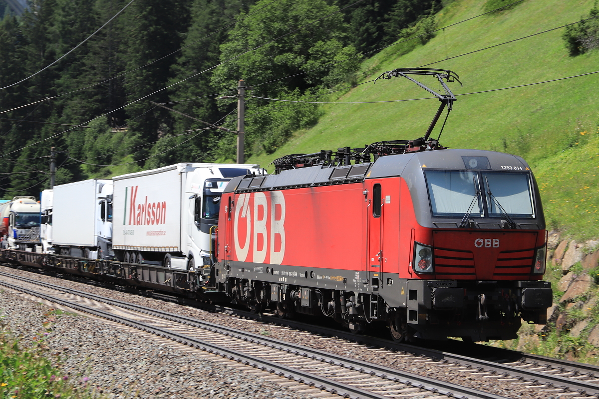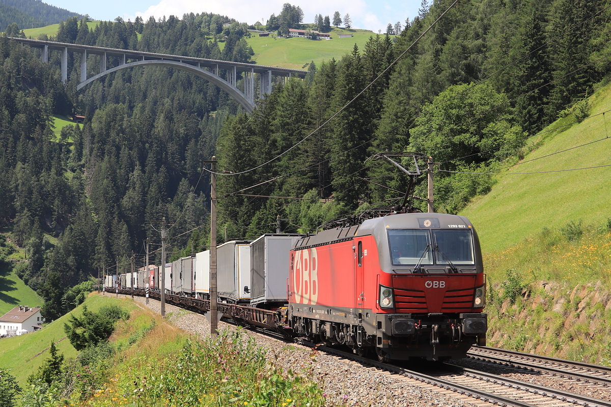 ÖBB 1293 021 mit ROLA von Wörgl Terminal Nord nach Brennersee hier kurz vor dem Bahnhof St. Jodok am Brenner. Aufgenommen am 23.07.2021