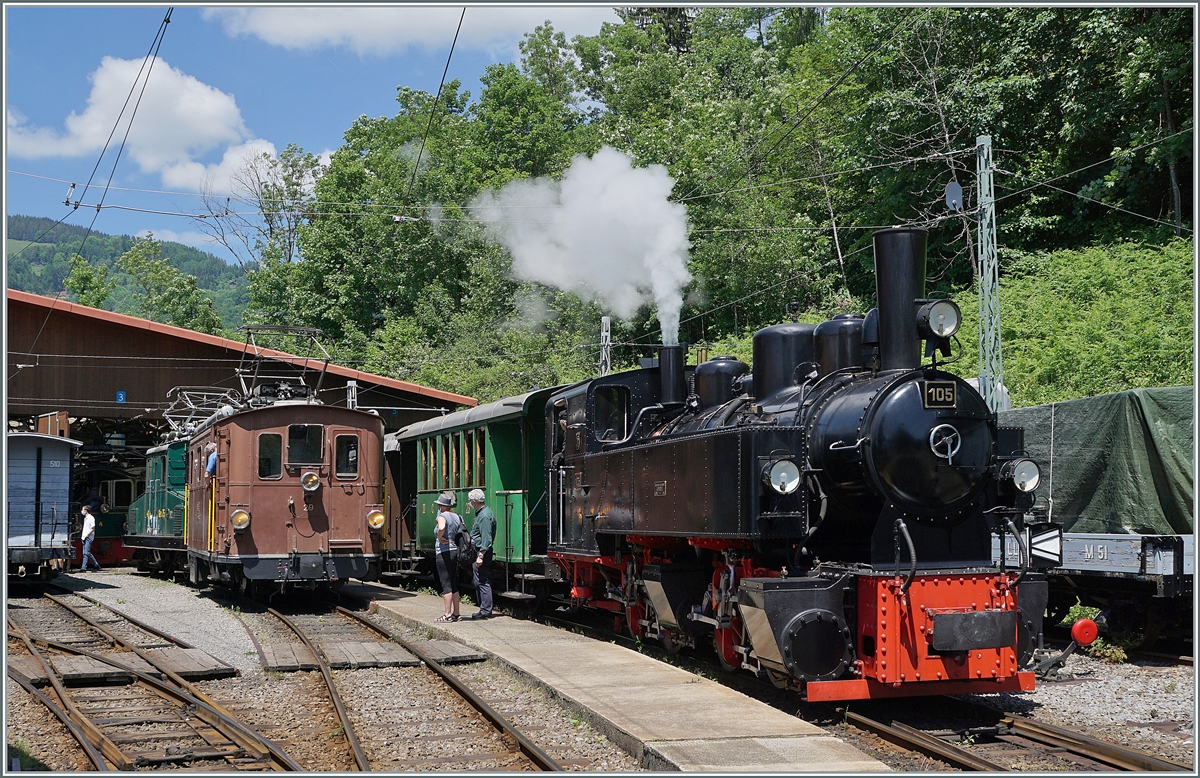 Lok 114 703 und Lok 86 1744 stehen in Putbus bereit für Fahrten eines historischen Reisezugs zwischen Bergen und Lauterbach Mole. Des Weiteren soll noch eine Ferkeltaxi zum Einsatz kommen. - 28.07.2021