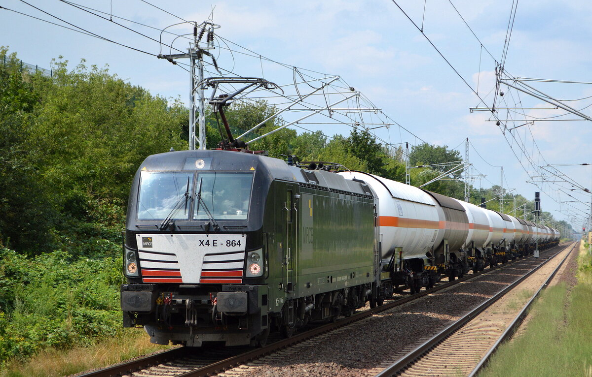 TX Logistik AG, Troisdorf [D] mit der MRCE Vectron  X4 E - 864  [NVR-Nummer: 91 80 6193 864-6 D-DISPO] und einem Ganzzug Druckgaskesselwagen am 26.07.21 Durchfahrt Bf. Berlin Hohenschönhausen.