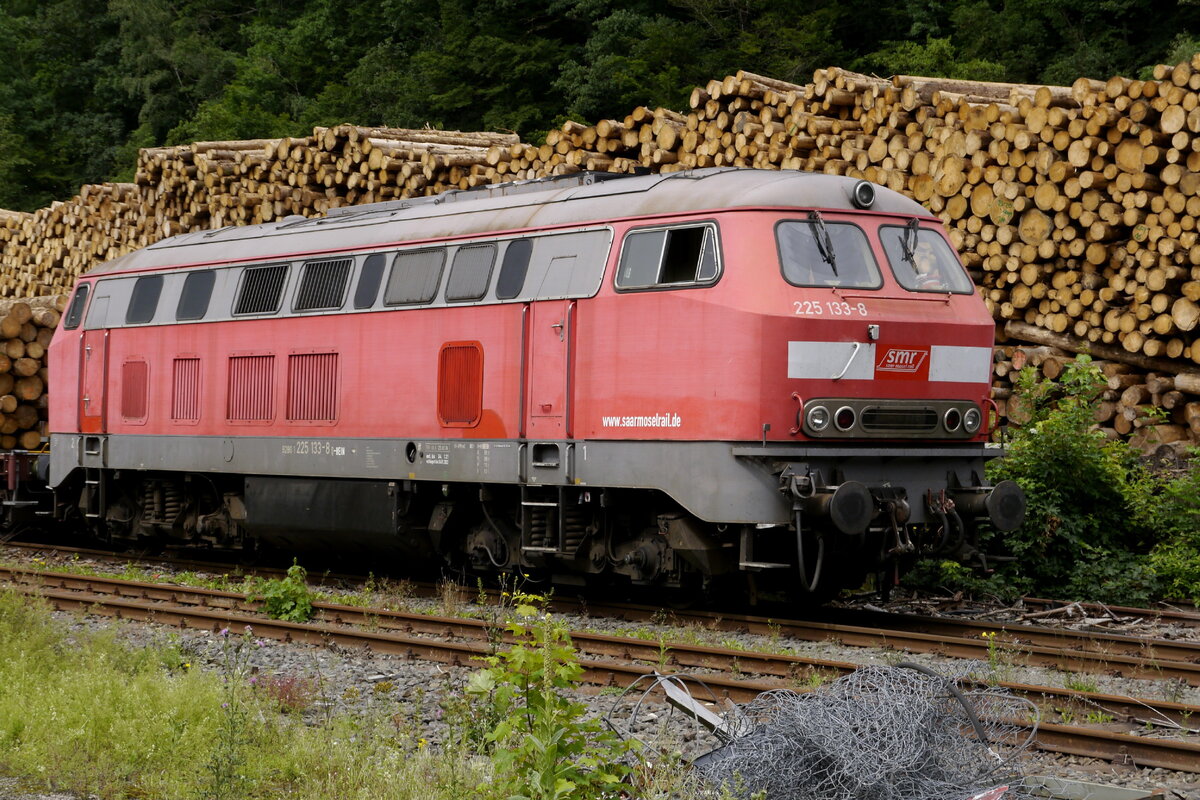 Unmengen von Fichtenholz sind aus dem Sauerland abzutransportieren. Die smr (SaarMoselRail) ist mit zwei Loks in Lüdenscheid-Brügge im Einsatz (28.7.21): 92 80 1225 133-8 D-HEIN ist eine davon.