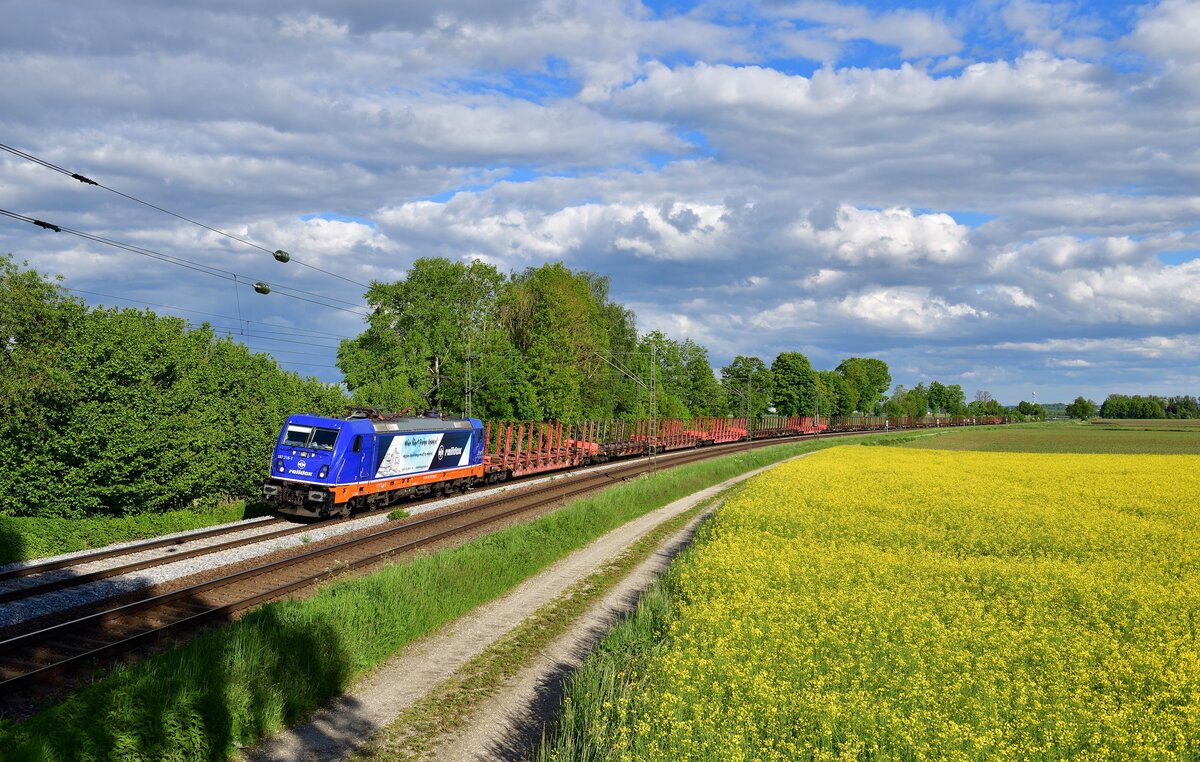 187 318 mit einem Rungenwagenzug am 25.05.2021 bei Langenisarhofen.