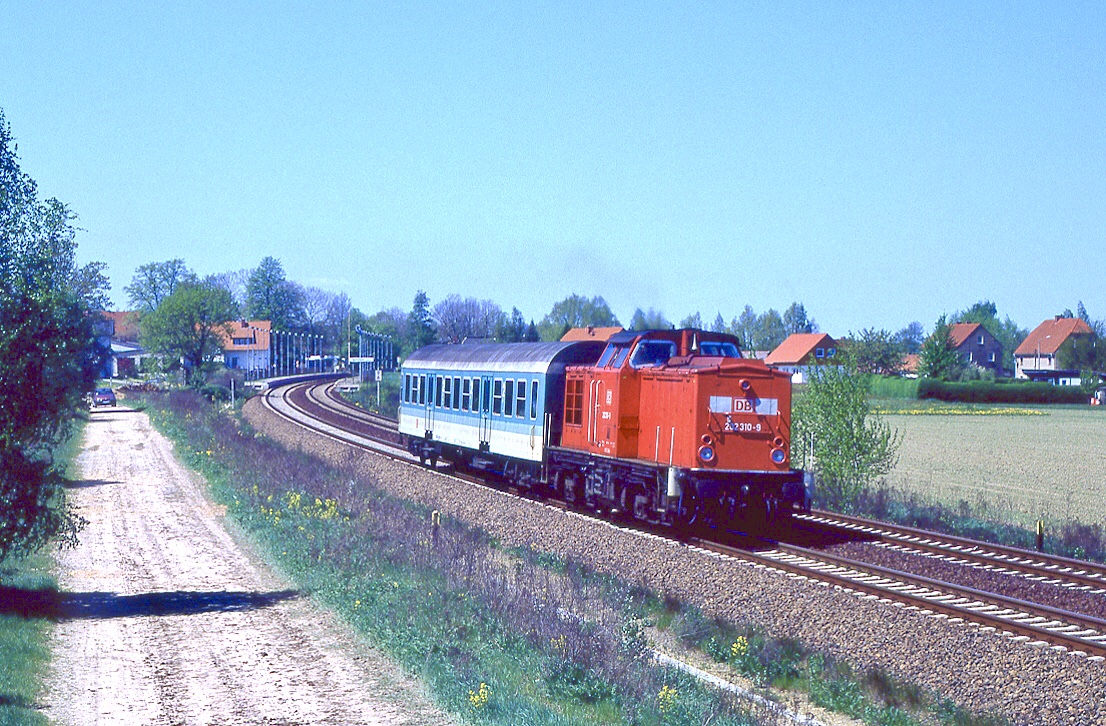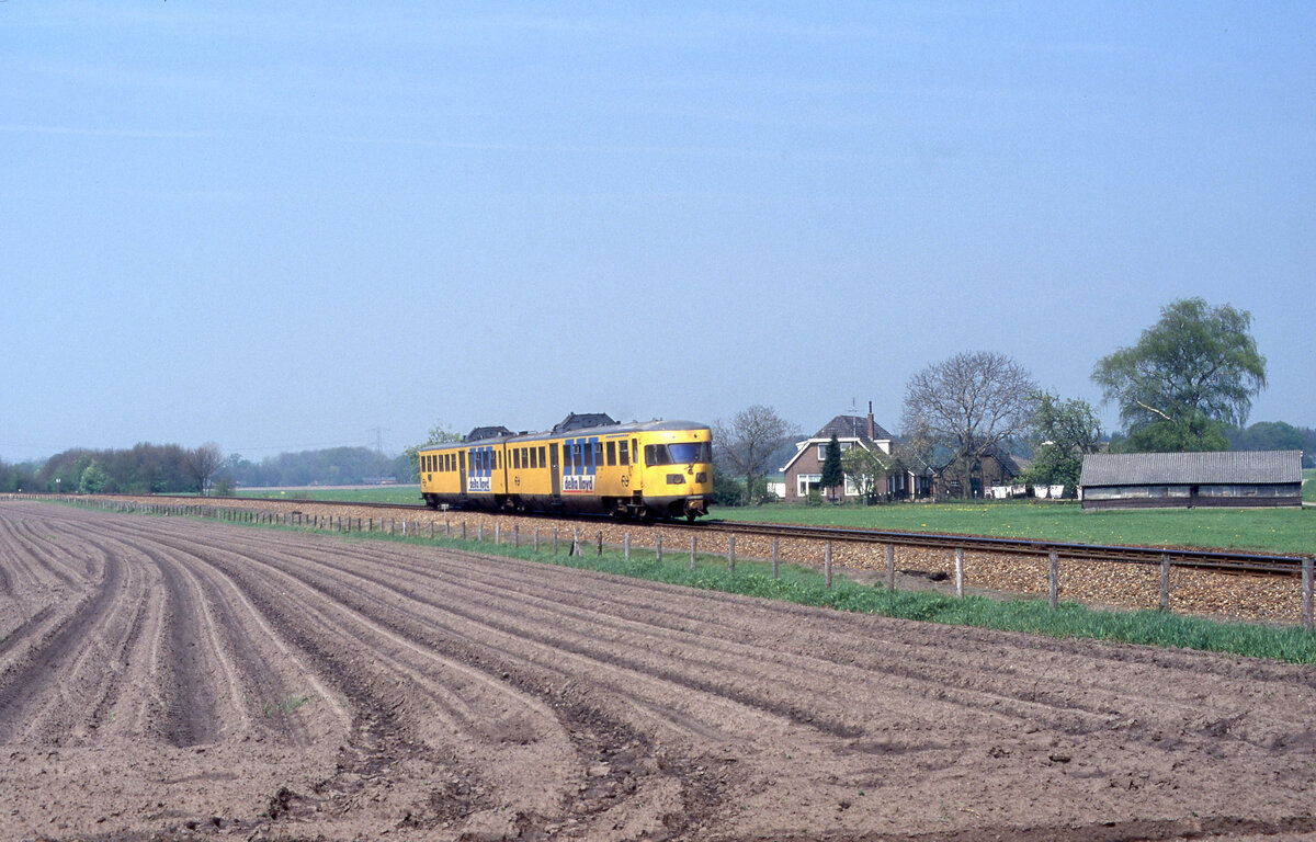 NS 185 unterwegs in ländlicher Umgebung als Zug 7846 (Winterswijk - Zutphen) nahe der ehemalige Haltestelle Warken am 02.05.1997, 13.23u. (Nachschuss). Scan (Bild 7298, Fujichrome100).