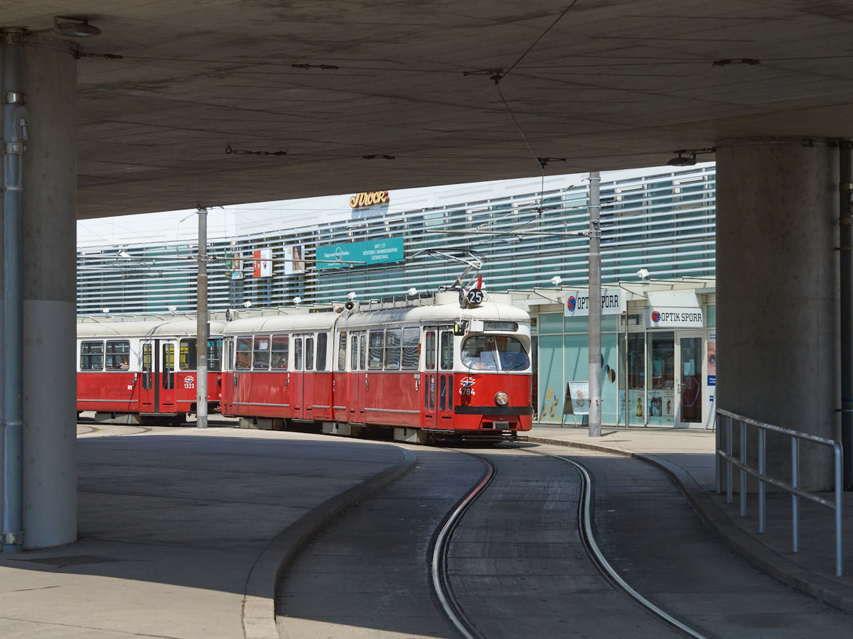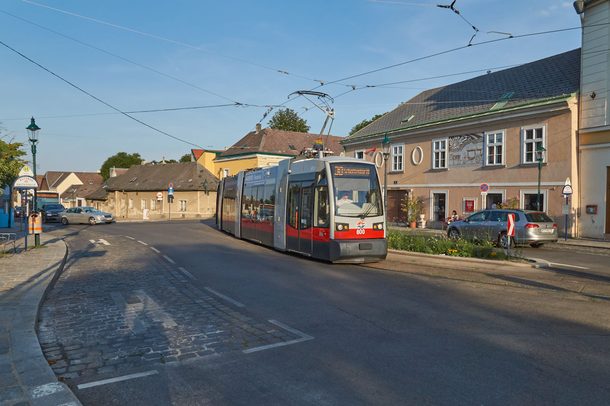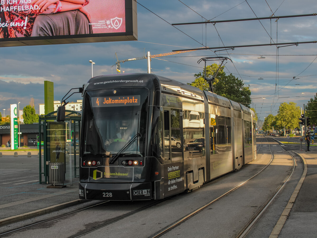 Graz. Am Abend des 29.05.2021 steht die Variobahn 228 in der Haltestelle Fröhlichgasse.