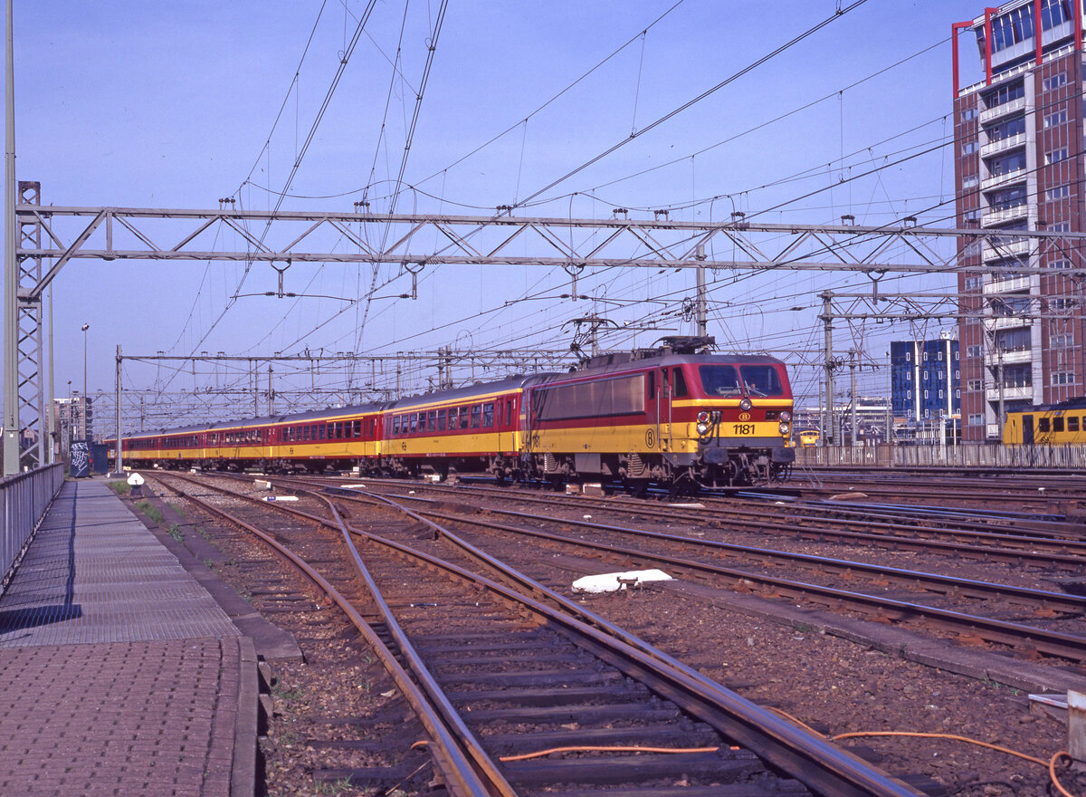 Ankunft des IC-181 (Brussel Zuid - Amsterdam CS) mit NMBS lok 1181 und Wagen Typ ICR Benelux der NS. Amsterdam CS, 27.03.1989. Scan (Bild 4881), Agfachrome 100RS Professional).